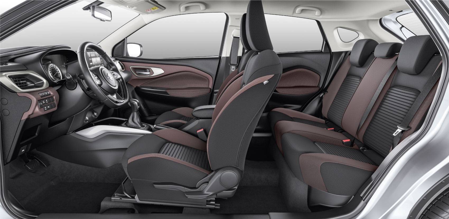Al ingresar al interior del Suzuki Fronx, lo primero que llamará tu atención será el perfecto equilibrio entre su robustez y sofisticación. Los asientos están hechos de material de alta calidad que destila elegancia. Las suaves almohadillas forradas en tela doble tono, detalles cromados en el panel de instrumentos y los adornos de las puertas le dan un aspecto de primera.